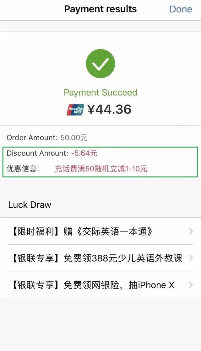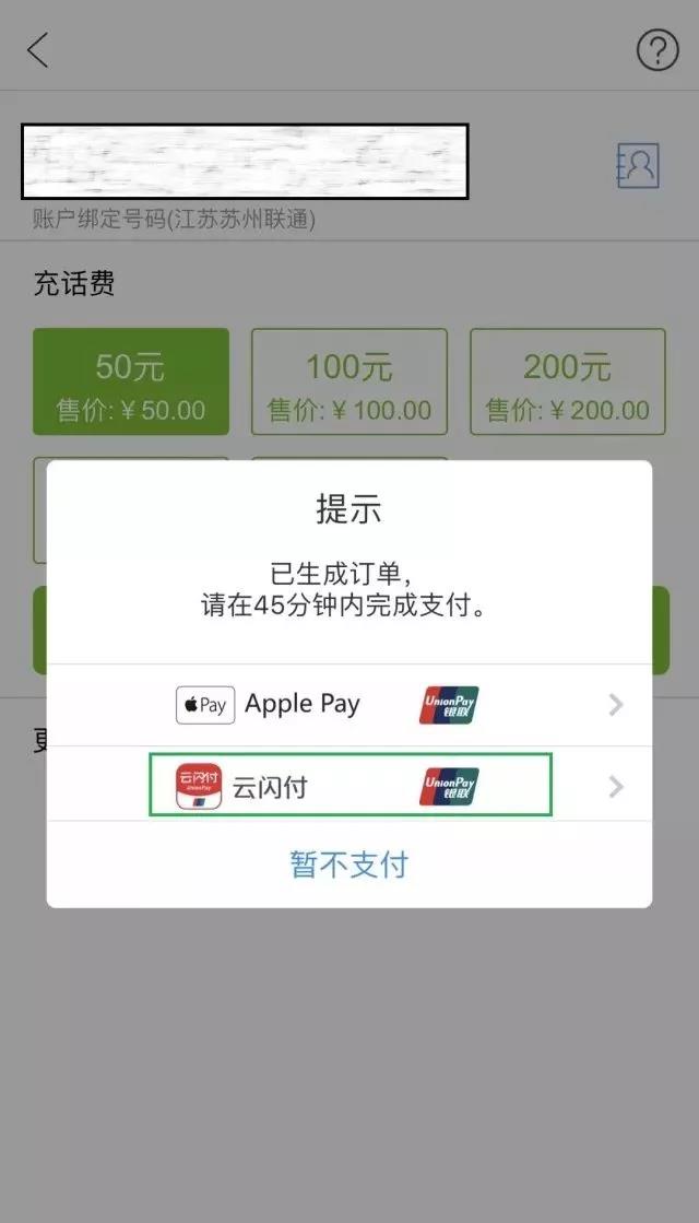 在云闪付APP内进行手机充值时选择【云闪付】付款,,,充值金额(非实付金额)满50元,,,即可享受随机立减1-10元优惠。。。活动期间每日限量5万笔,,,单用户每自然月限享受1笔优惠,,,数量有限,,,先到先得。。。