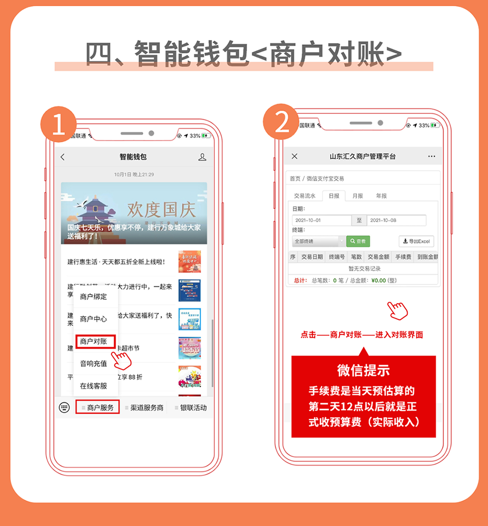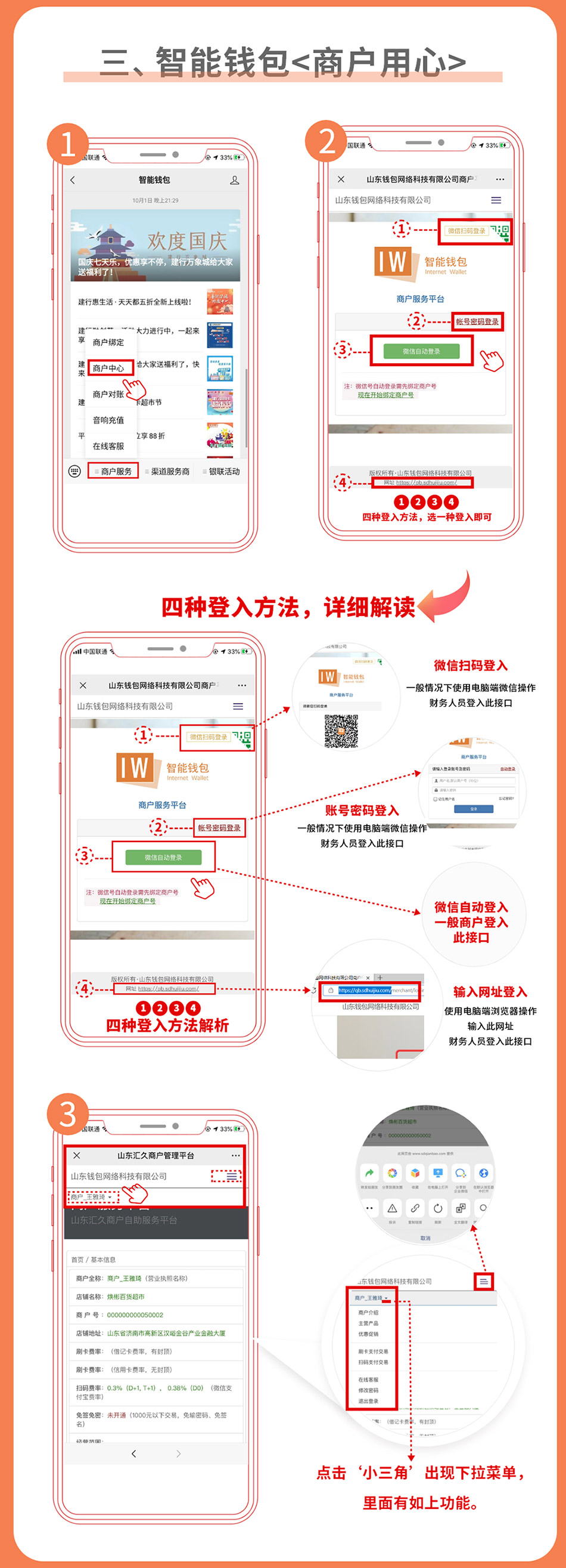 智能钱包对账平台分为电脑端和公众平台两种登录方式,,,使用条码付直联商户号登录。。。